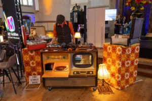 Bij single DJ huren krijg je de standaard retro-setup: stijlvol gekleed in jaren 60-outfits, met ons iconische DJ-meubel inclusief oude TV-beelden voor nostalgische filmpjes, sfeervolle lampjes, extra kleden voor een cozy vibe, en tierelantijntjes die de vinyl-jaren tot leven brengen.